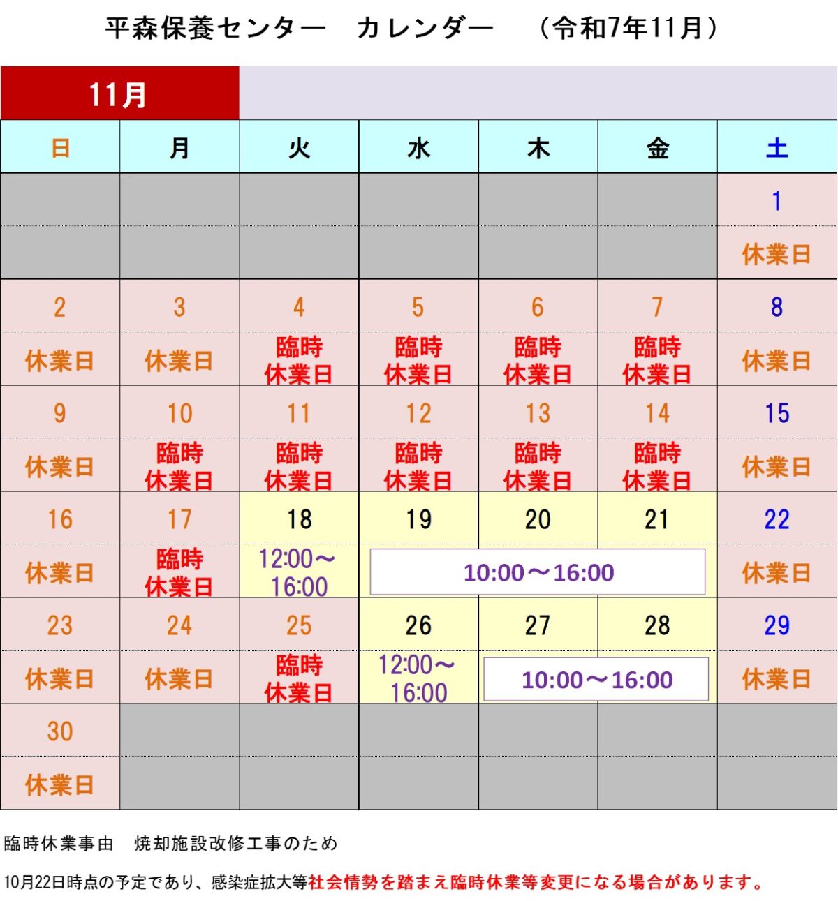 平森保養センターの令和7年11月営業日について 2025年10月24日 保養センター by 岩手・玉山環境組合スタッフ. 平森保養センターの令和7年11月営業日は次のとおりです。 (画像をクリックすると大きく表示されます。) 前の記事