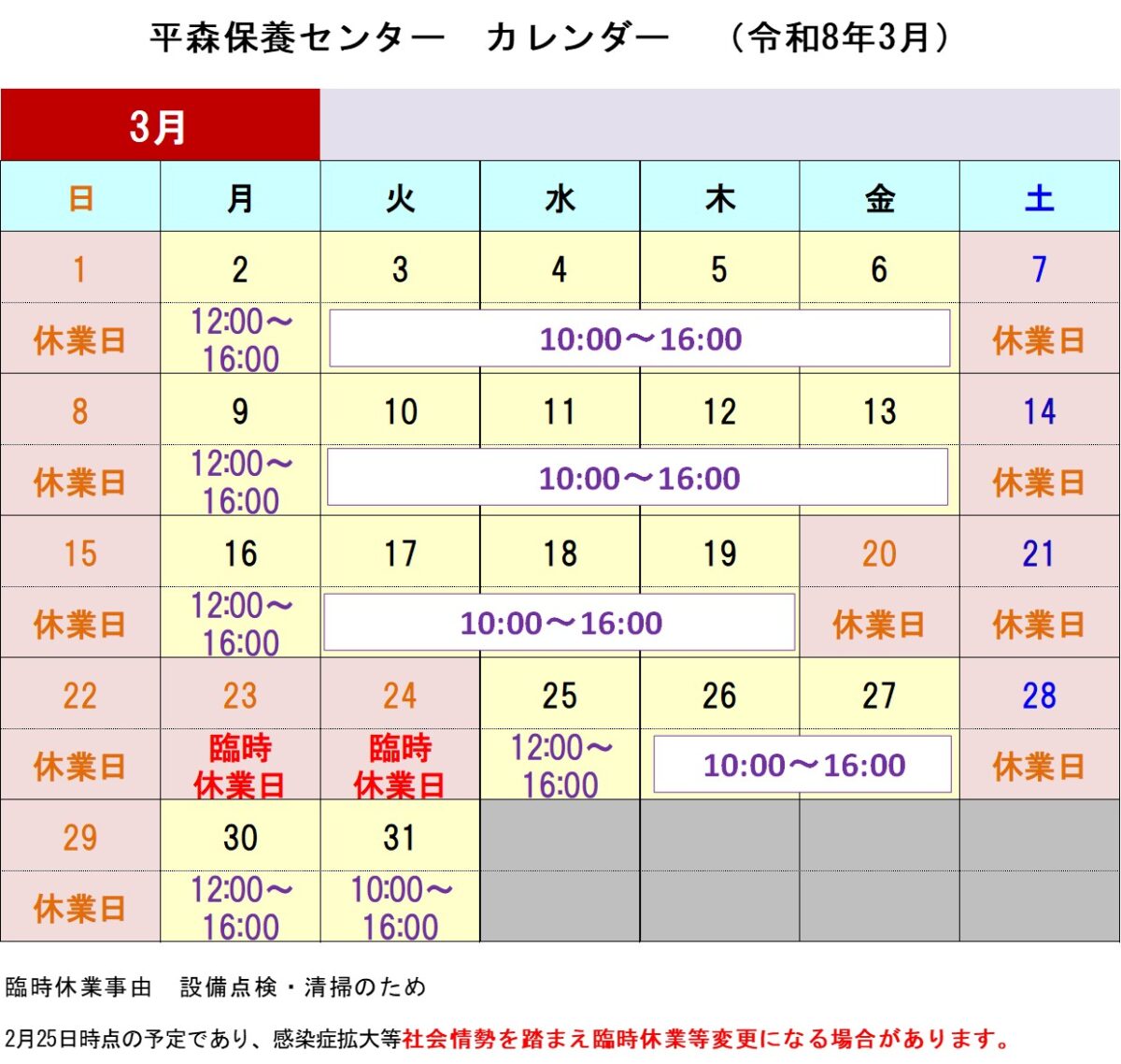 平森保養センターの令和8年3月営業日について 2026年2月25日 保養センター by 岩手・玉山環境組合スタッフ. 平森保養センターの令和8年3月営業日は次のとおりです。 (画像をクリックすると大きく表示されます。) 前の記事